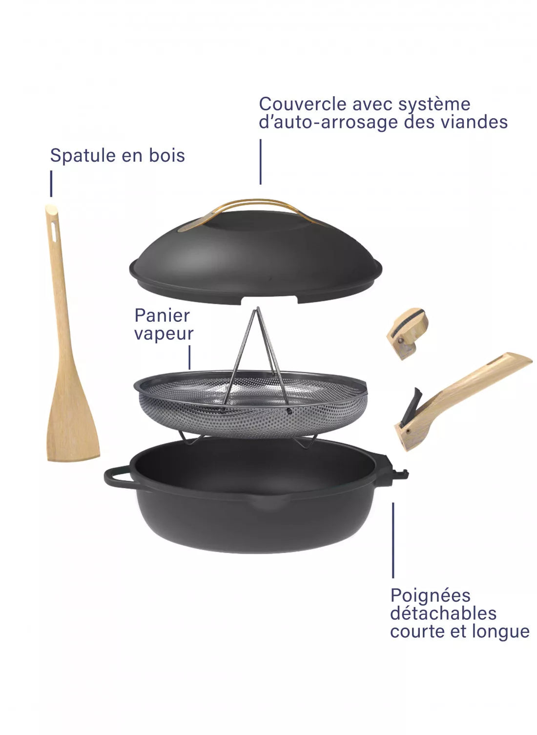 Inclusief: 2 afneembare handgrepen (een lange en een korte), stoommandje en houten spatel.