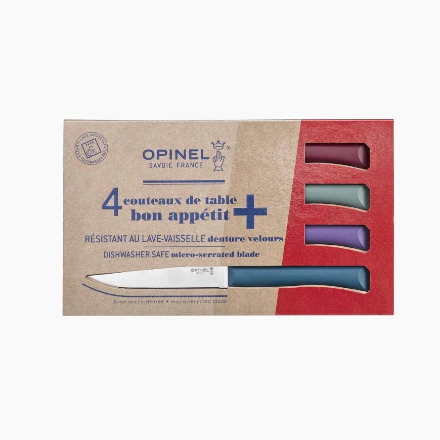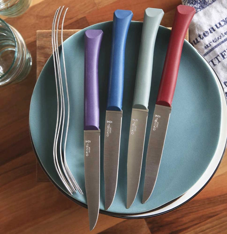 De tafelmessen Bon Appétit + hebben een handvat van polymeer waardoor ze in de vaatwasser kunnen, en een licht gekarteld lemmet dat duurzaam scherp blijft.